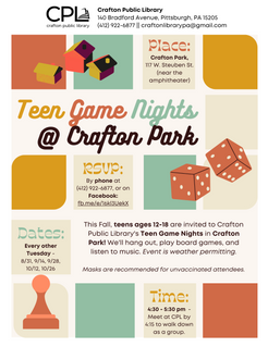 At the Crafton Public Library, I was responsible for planning and executing library programs for our youngest patrons and their families, covering programming from birth through age 18. Here is a sampling of some of the programs I offered. I also designed all of the posters for these programs.